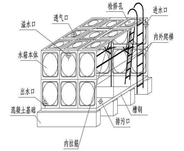 3.在施工安裝時,消防水池及消防水箱的外壁與建筑本體結構墻面或其他池壁之間的凈距,要滿足施工、裝配和檢修的需要。無管道的側面,凈距不宜小于0.7m;有管道的側面,凈距不宜小于1.0m,且管道外壁與建筑本體墻面之間的通道寬度不宜小于0.6m;設有人孔的池頂,頂板面與上面建筑本體板底的凈空不應小于0.8m。